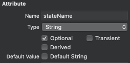 생성을 하면 Attribute가 추가되고 화면 오른쪽 사이드에 Data Model Inspector에서 속성을 세팅할수 있습니다. 이름과 타입을 선택하고 옵셔널이 체크되어 있는지 확인합니다.