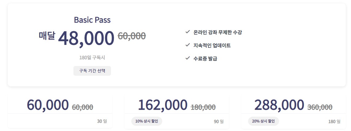현재는 구독형으로 되어 강의하나만을 결제할수는 없지만 관심있는 부분을 요리조리 살펴가며 듣고싶은걸 들을수 있다는 점에서 참 좋은것 같아요 ㅎㅎ 관심있으신분은 한번 들어가서 살펴보시기 바랍니다
