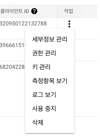 7. 생성된 계정 오른쪽을 보시면 작업항목을 누르시고 키 관리 를 누르세요