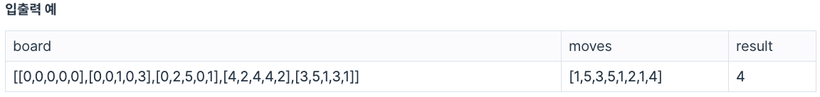 게임 화면의 격자의 상태가 담긴 2차원 배열 board와 인형을 집기 위해 크레인을 작동시킨 위치가 담긴 배열 moves가 매개변수로 주어질 때, 크레인을 모두 작동시킨 후 터트려져 사라진 인형의 개수를 return 하도록 solution 함수를 완성해주세요.