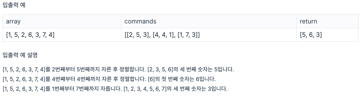배열 array, [i, j, k]를 원소로 가진 2차원 배열 commands가 매개변수로 주어질 때, commands의 모든 원소에 대해 앞서 설명한 연산을 적용했을 때 나온 결과를 배열에 담아 return 하도록 solution 함수를 작성해주세요.