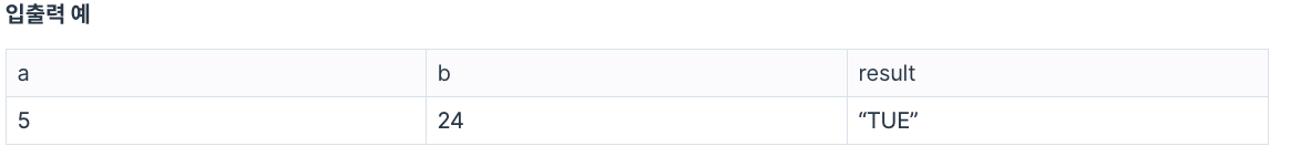 입니다. 예를 들어 a=5, b=24라면 5월 24일은 화요일이므로 문자열 TUE를 반환하세요.