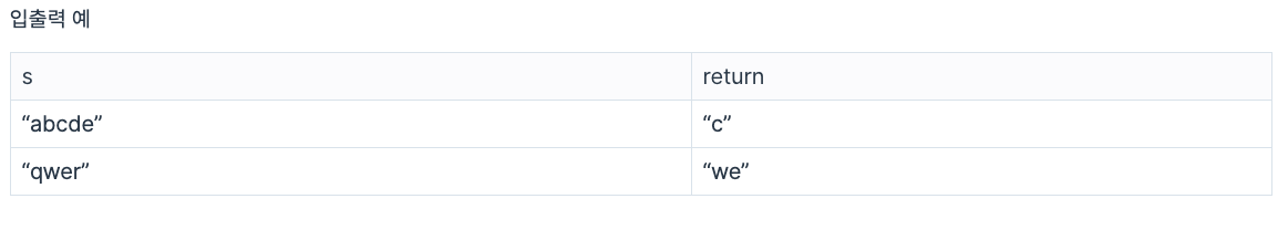 단어 s의 가운데 글자를 반환하는 함수, solution을 만들어 보세요. 단어의 길이가 짝수라면 가운데 두글자를 반환하면 됩니다.재한사항