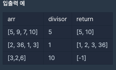 divisor로 나누어 떨어지는 element가 하나도 없다면 배열에 -1을 담아 반환하세요.