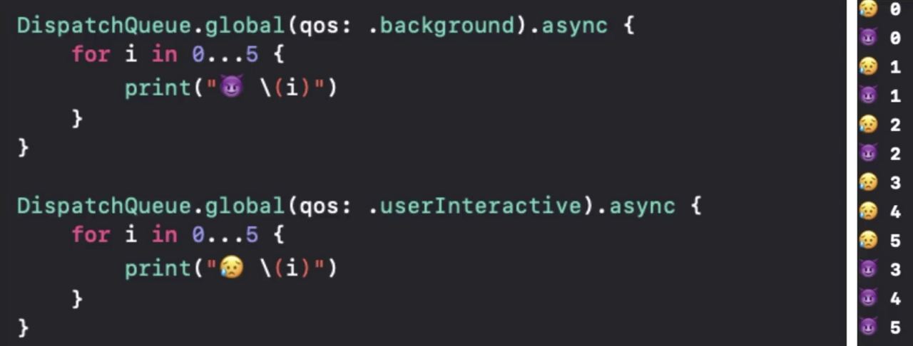 - 큐에 들어가는 테스크의 우선순위를 QoS(Quality of Service) 를 이용해서 표현할수 있습니다. 번호가 낮을수록 높은 순위 입니다.