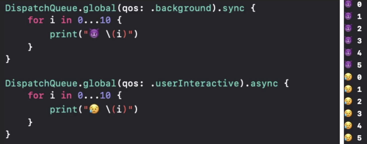 - 동기실행이기 때문에 두개의 큐가 같이 실행이 되고 qos부분의 우선순위를 보면 아래코드가 더높기 때문에 아래코드가 먼저 실행되는 것을 볼수있다.