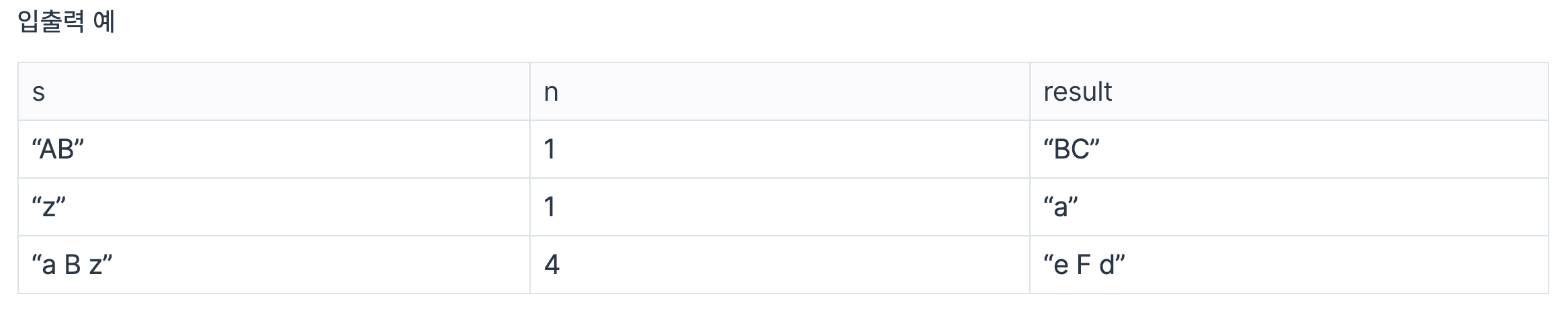 어떤 문장의 각 알파벳을 일정한 거리만큼 밀어서 다른 알파벳으로 바꾸는 암호화 방식을 시저 암호라고 합니다. 예를 들어 AB는 1만큼 밀면 BC가 되고, 3만큼 밀면 DE가 됩니다. z는 1만큼 밀면 a가 됩니다. 문자열 s와 거리 n을 입력받아 s를 n만큼 민 암호문을 만드는 함수, solution을 완성해 보세요.