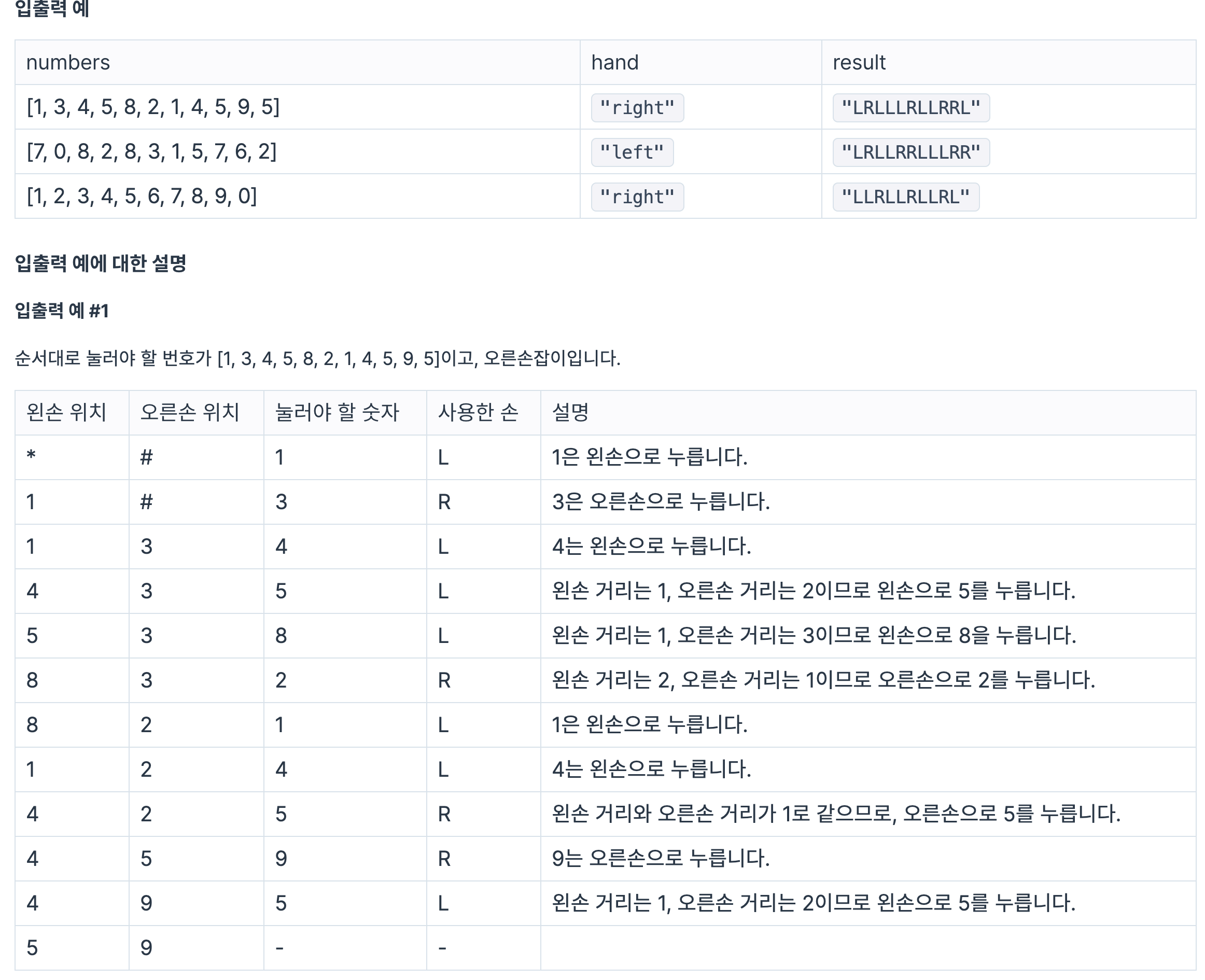 순서대로 누를 번호가 담긴 배열 numbers, 왼손잡이인지 오른손잡이인 지를 나타내는 문자열 hand가 매개변수로 주어질 때, 각 번호를 누른 엄지손가락이 왼손인 지 오른손인 지를 나타내는 연속된 문자열 형태로 return 하도록 solution 함수를 완성해주세요.