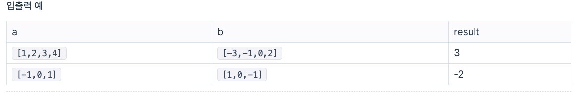이때, a와 b의 내적은 a[0]*b[0] + a[1]*b[1] + ... + a[n-1]*b[n-1] 입니다. (n은 a, b의 길이)